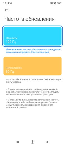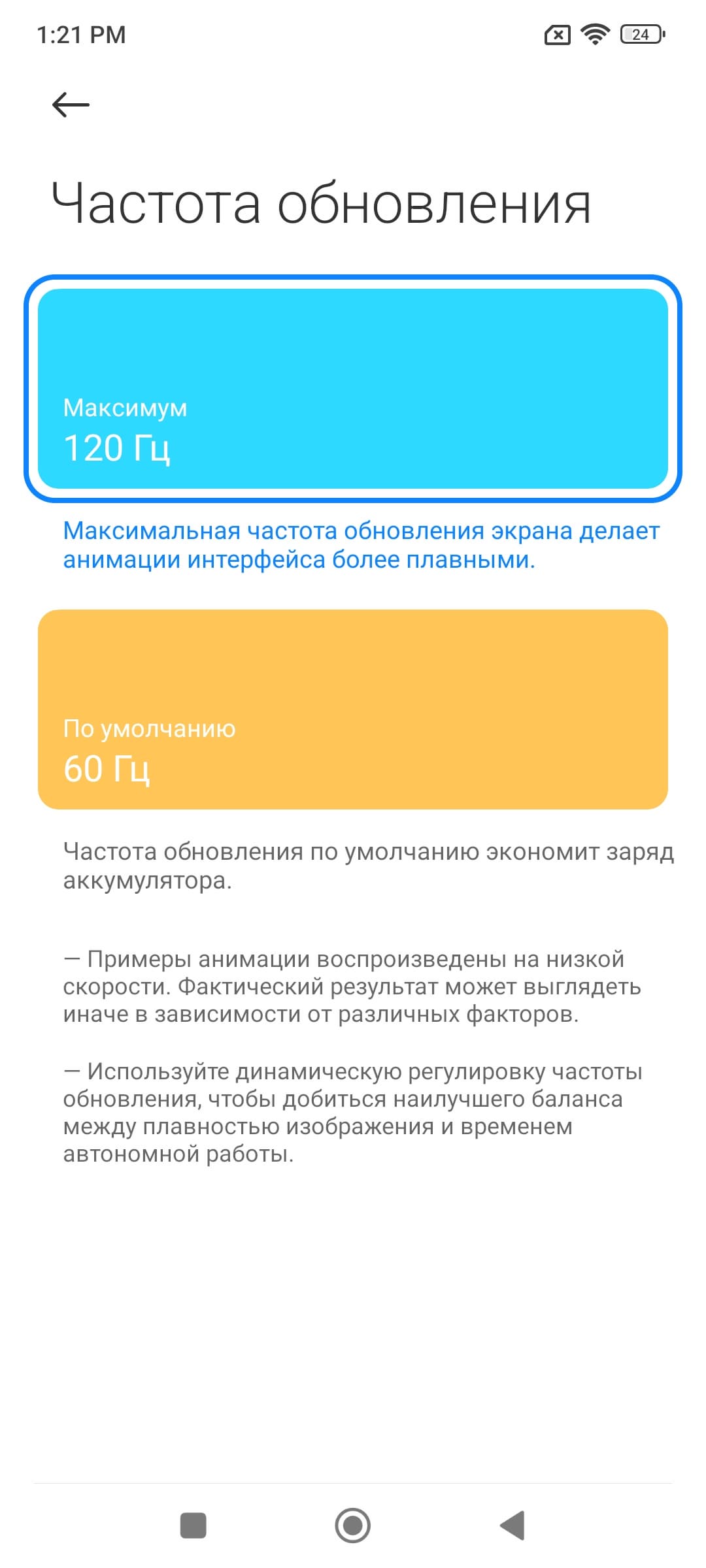 В настройках экрана можно включить режим с повышенной до 120 Гц частотой обновления: