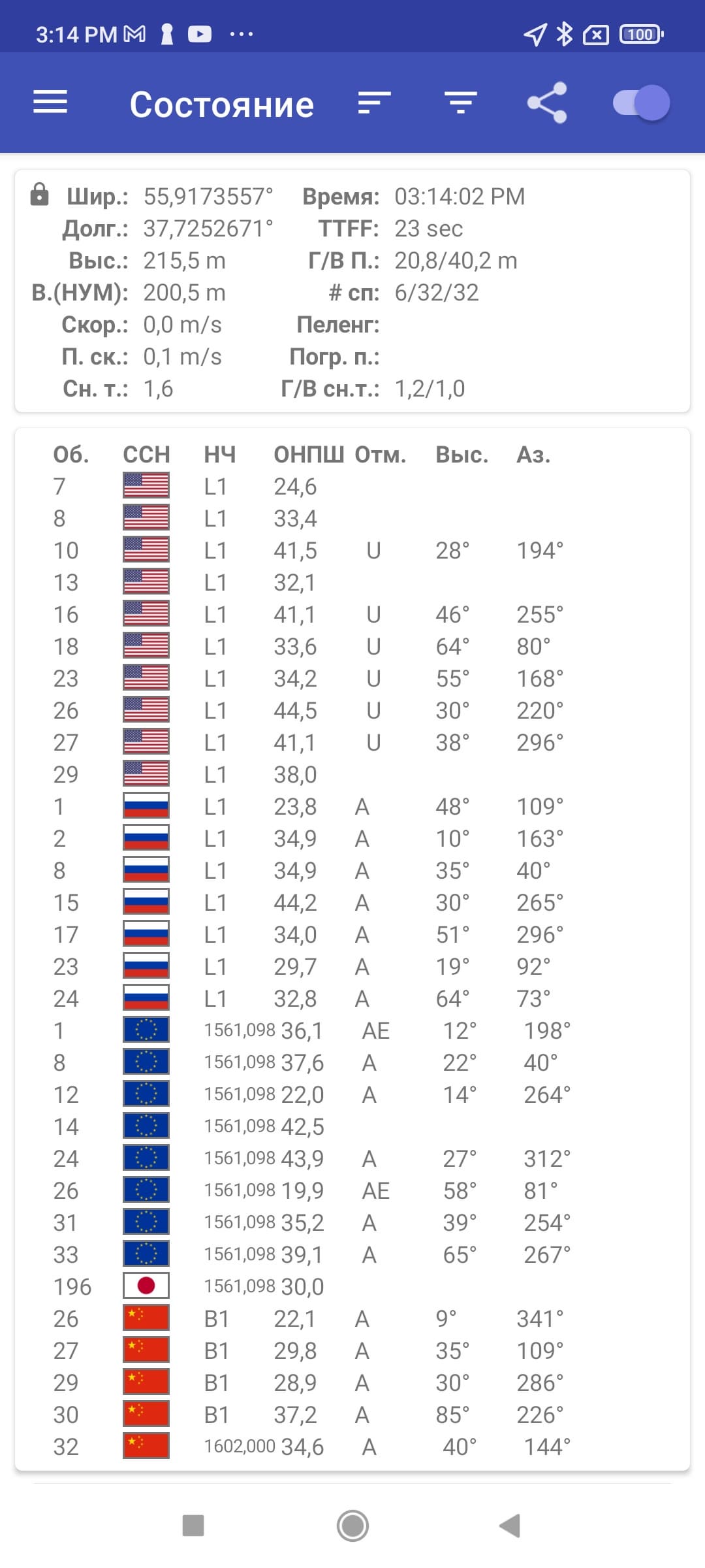 Навигационный модуль работает с GPS (с A-GPS), Глонасс, Galileo и BDS. Первые спутники при холодном старте обнаруживаются быстро, точность позиционирования удовлетворительная.