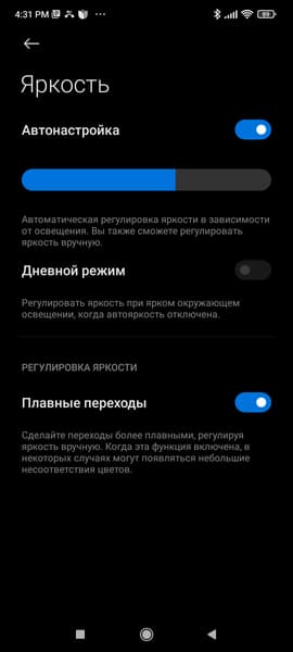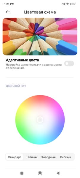 Присутствует функция Адаптивные цвета, которая, если ее включить, подстраивает цветовой баланс под условия окружающей среды. Мы включили эту функцию и проверили, как она работает (профиль Яркий):