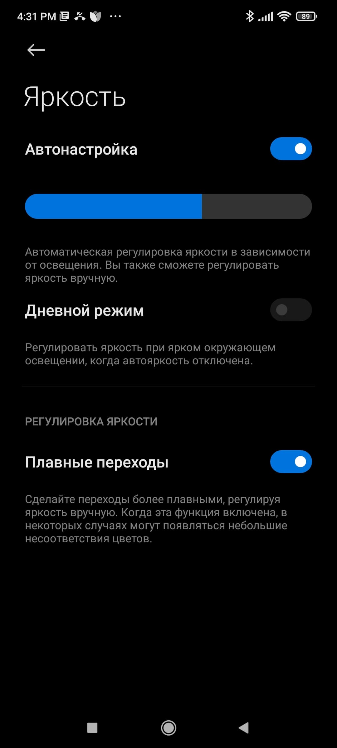 При ручном управлении яркостью и при выводе белого поля во весь экран максимальное значение яркости составило около 470 кд/м² в обычных условиях, а на очень ярком свету и в случае автоматической регулировки оно может повышаться до 875 кд/м². Также нужно учитывать, что для этого типа экрана чем меньше площадь белого на экране, тем он светлее, то есть фактическая максимальная яркость белых участков будет почти всегда выше указанных значений. В итоге, учитывая отличные антибликовые свойства, читаемость днем на солнце, должна быть на хорошем уровне. При ручном управлении и при включении функции Дневной режим на очень ярком свету яркость повышается до 470 кд/м², даже если она была установлена на меньшее значение. Минимальное значение яркости при ручном управлении яркостью составило 10 кд/м², а в случае автоматической регулировки в полной темноте яркость снижается до 5,5 кд/м². В итоге полной темноте яркость можно понизить до комфортного значения. В наличии автоматическая регулировка яркости по датчику освещенности (он находится у верхнего края фронтальной панели правее центра по горизонтали). В автоматическом режиме при изменении внешних условий освещенности яркость экрана как повышается, так и понижается. Работа этой функции зависит от положения ползунка регулировки яркости: им пользователь может попытаться выставить желаемый уровень яркости в текущих условиях. Если не вмешиваться, то в полной темноте функция автояркости уменьшает яркость до 5,5 кд/м² (низковато), в условиях освещенного искусственным светом офиса (примерно 550 лк) устанавливает на 130 кд/м² (нормально), а условно на прямом солнечном свету яркость достигает 875 кд/м² (до максимума, так и нужно). Результат нас не совсем устроил, поэтому в полной темноте мы увеличили яркость до 10 кд/м², однако после цикла повышения и понижения внешней освещенности все вернулось к тем значениям, что были по умолчанию. Получается, что функция автоподстройки яркости работает не совсем адекватно, и не позволяет пользователю настраивать свою работу под индивидуальные требования.