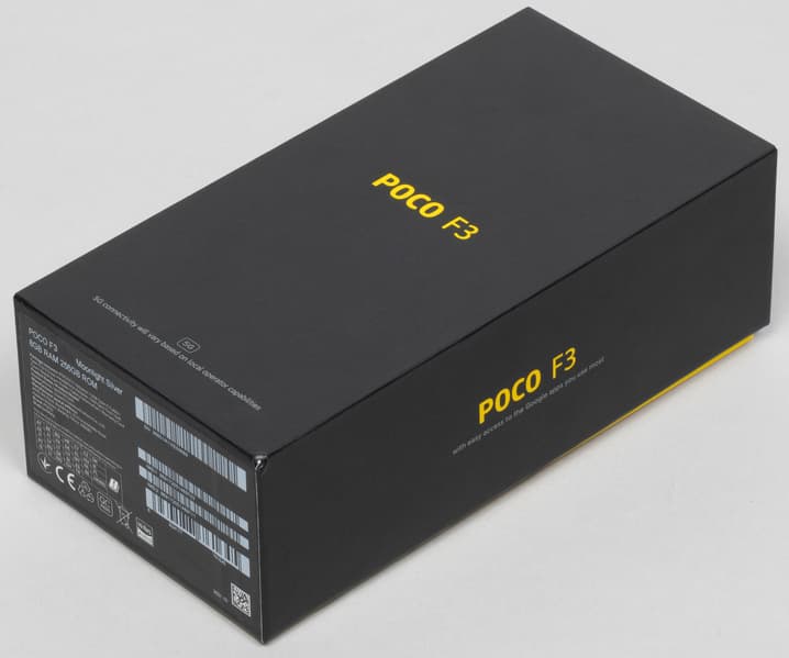 Poco F3 поставляется в твердой картонной упаковке, стильно оформленной в черном матовом цвете с желтым шрифтом.