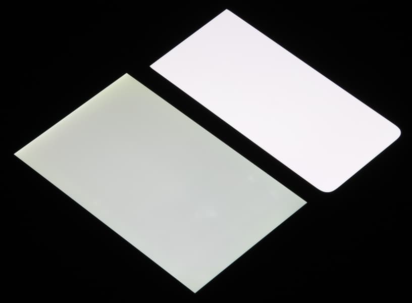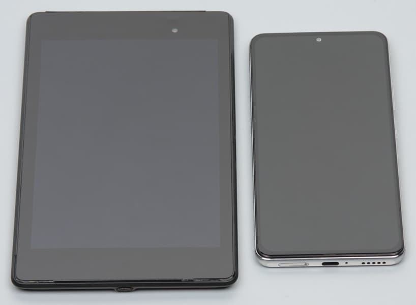 Лицевая поверхность экрана выполнена в виде стеклянной пластины с зеркально-гладкой поверхностью, устойчивой к появлению царапин. Судя по отражению объектов, антибликовые свойства экрана лучше, чем у экрана Google Nexus 7 (2013) (далее просто Nexus 7). Для наглядности приведем фотографию, на которой в выключенных экранах отражается белая поверхность (слева — Nexus 7, справа — Poco F3, далее их можно различать по размеру):