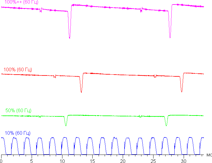 На любом уровне яркости присутствует значимая модуляция с частотой примерно 60, 120 или 480 Гц. На рисунке ниже приведены зависимости яркости (вертикальная ось) от времени (горизонтальная ось) для нескольких значений настройки яркости. Сначала для режима с частотой обновления 60 Гц: