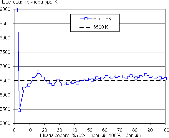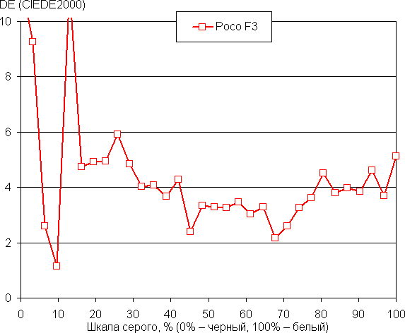Напомним, что в случае OLED-экранов яркость фрагментов изображения динамично меняется в соответствии с характером выводимого изображения — немного уменьшается для светлых в целом изображений. В итоге полученная зависимость яркости от оттенка (гамма-кривая), скорее всего, не соответствует гамма-кривой статичного изображения, так как измерения проводились при последовательном выводе оттенков серого почти на весь экран.