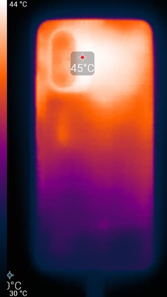 Нагрев больше в верхней части аппарата, что, видимо, соответствует расположению микросхемы SoC. По данным теплокамеры, максимальный нагрев составил 45 градусов (при температуре окружающего воздуха в 24 градуса), это существенно выше среднего значения для данного теста среди современных смартфонов.