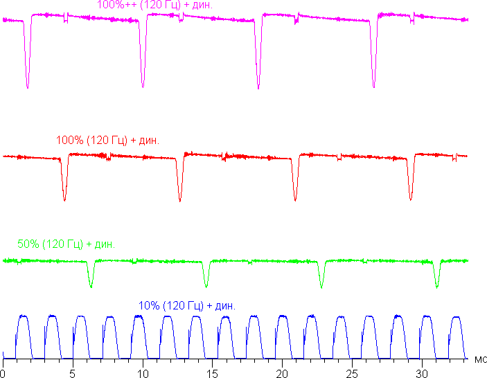 Видно, что на высокой и средней яркости частота модуляции увеличилась в 2 раза, а на низкой яркости характер модуляции не изменился. Отметим, что частота обновления 120 Гц устанавливается, только если на экран выводится динамическое изображение.