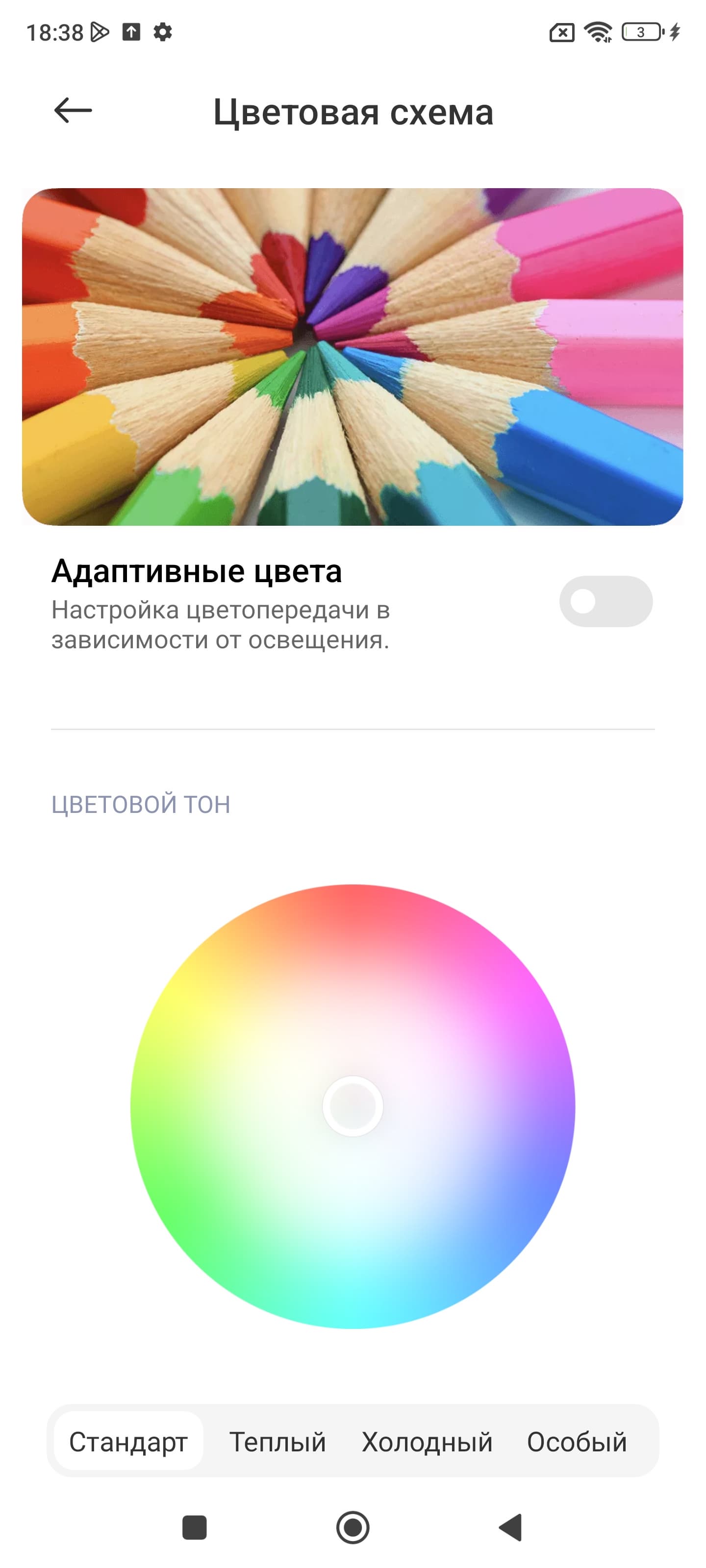 Присутствует функция Адаптивные цвета, которая, если ее включить, подстраивает цветовой баланс под условия окружающей среды. Мы включили эту функцию и проверили, как она работает (профиль Яркие):