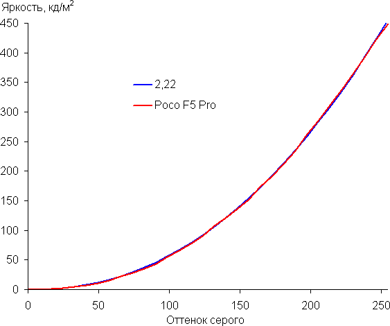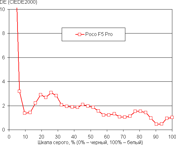 Напомним, что в случае OLED-экранов яркость фрагментов изображения динамично меняется в соответствии с характером выводимого изображения — немного уменьшается для светлых в целом изображений. В итоге полученная зависимость яркости от оттенка (гамма-кривая), скорее всего, не соответствует гамма-кривой статичного изображения, так как измерения проводились при последовательном выводе оттенков серого почти на весь экран.