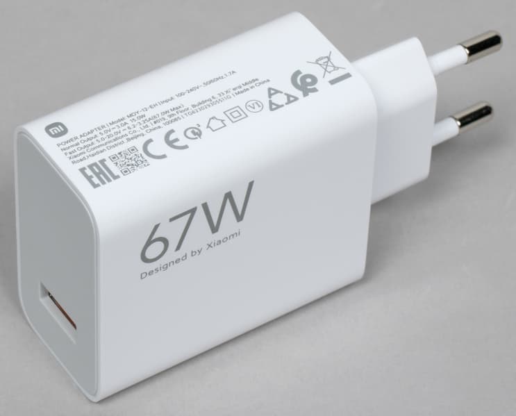 Комплект стандартный: соединительный кабель, защитный чехол и ЗУ с максимальной выходной мощностью 67 Вт.