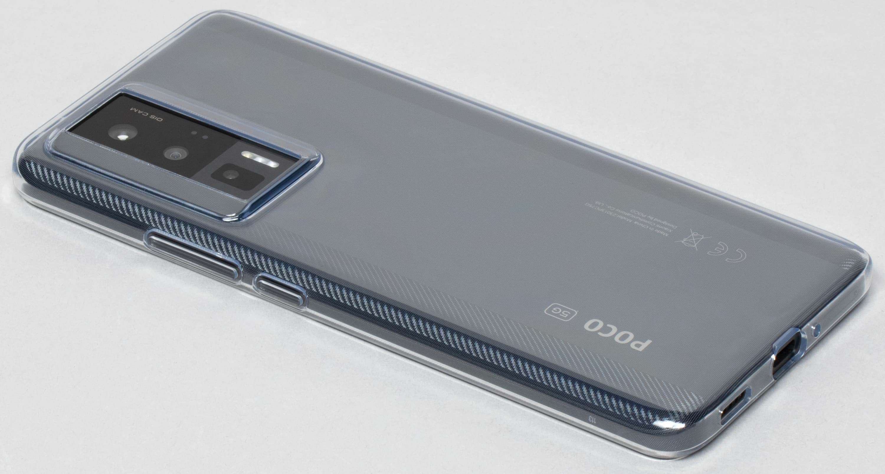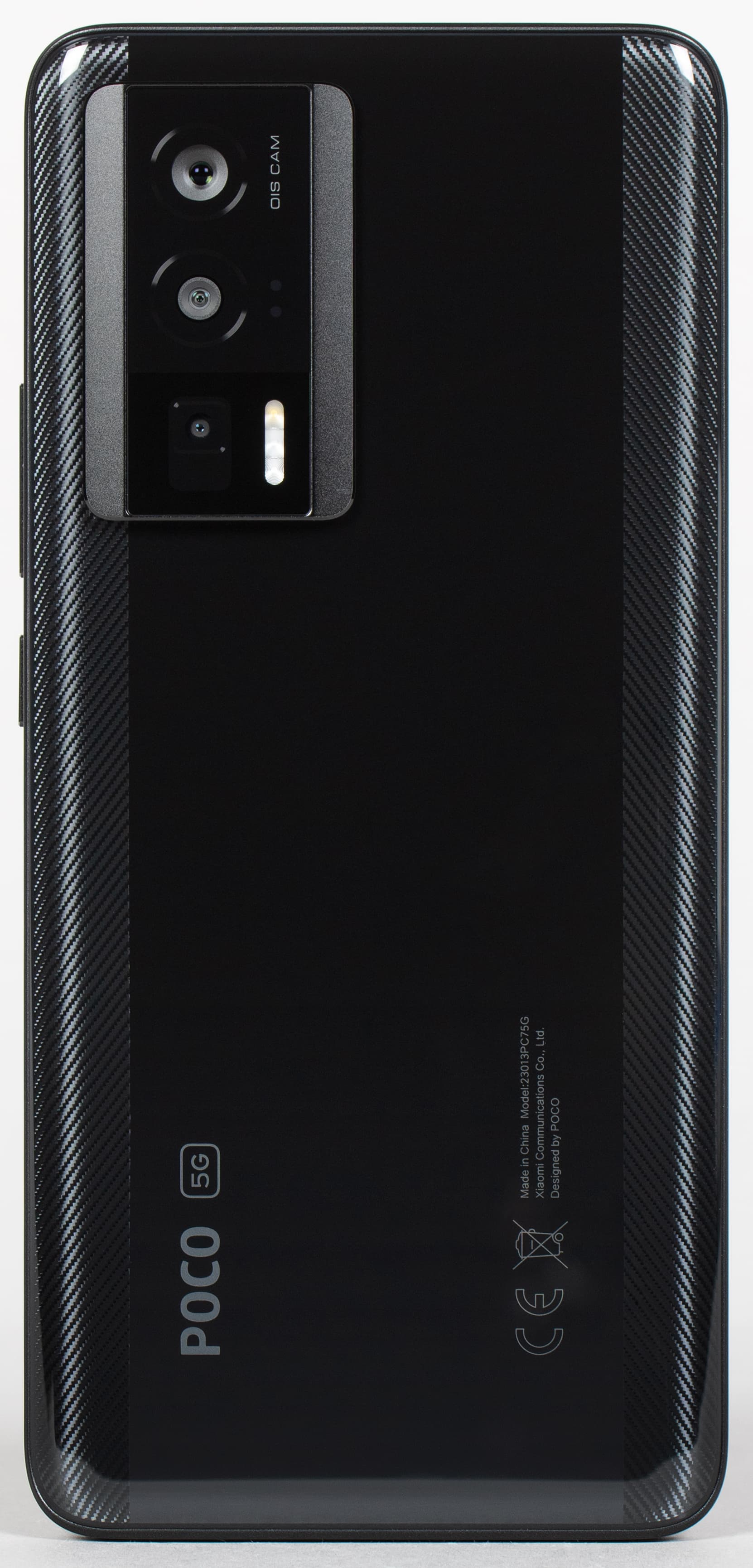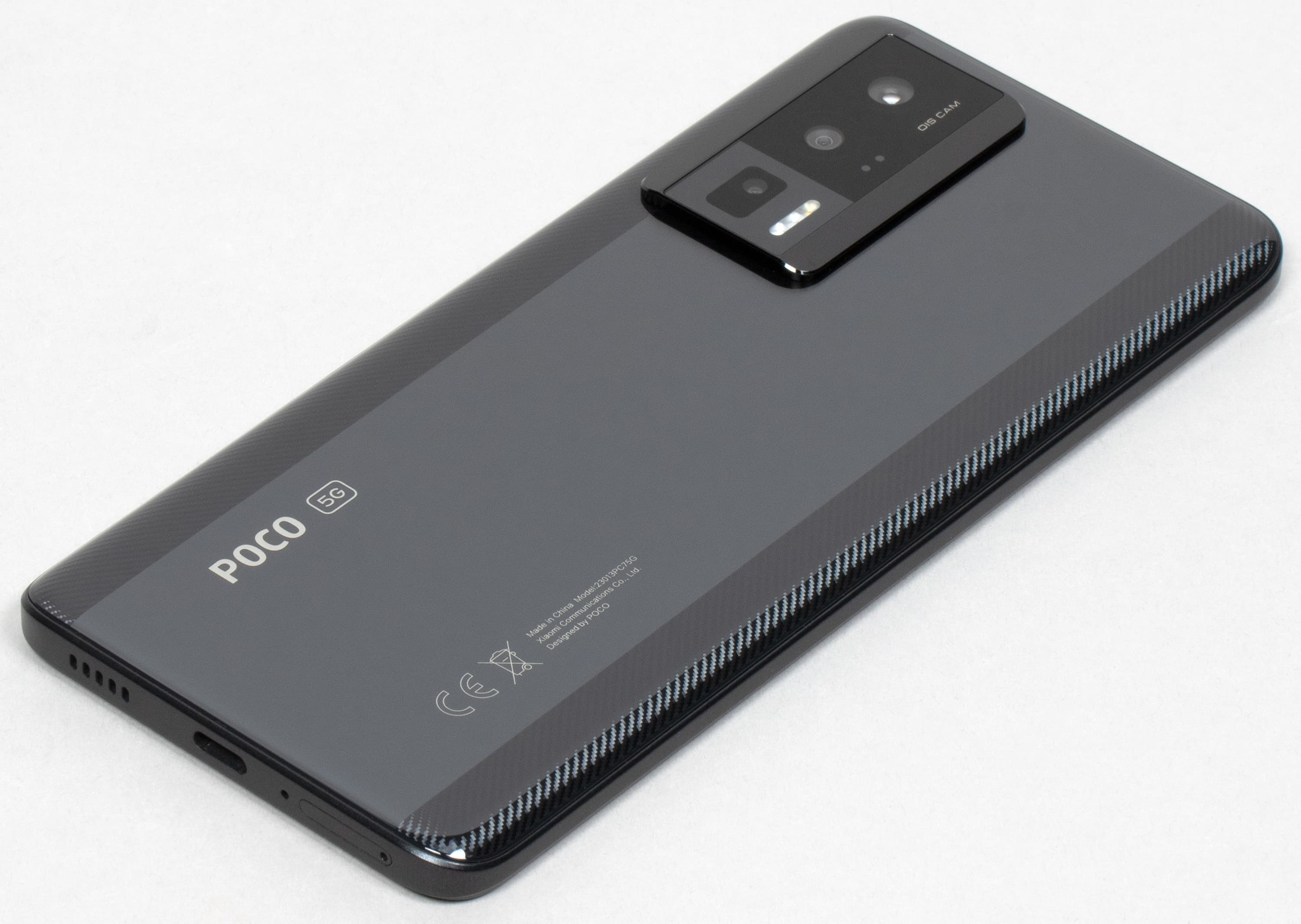 Poco F5 Pro получил своеобразный «модифицированный» дизайн, где модные и актуальные плоские и широкие бока сочетаются со старомодными загнутыми краями задней стенки, которая здесь вовсе не плоская. Это удачный дизайн, поскольку он позволяет крепко удерживать смартфон за всё еще довольно широкие бока, а нижняя часть корпуса в форме «лодочки» при этом более комфортно ложится в ладонь.