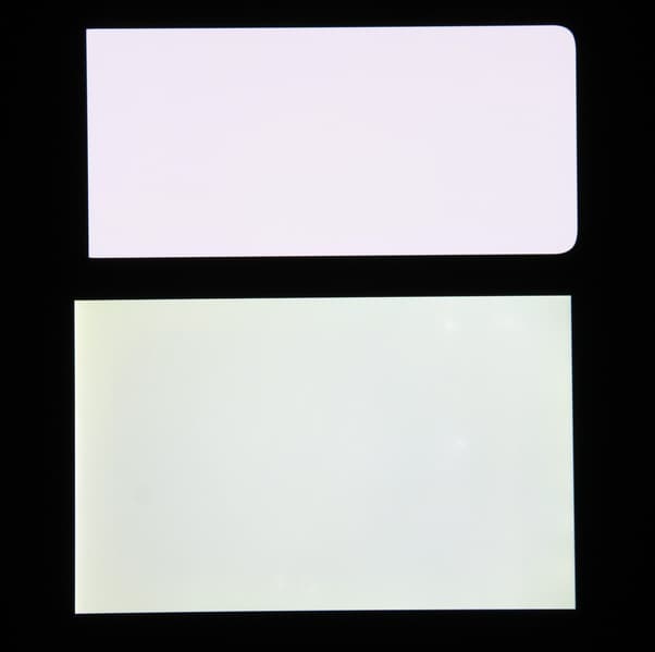 Экран характеризуется великолепными углами обзора. Правда, белый цвет при отклонении на большие углы приобретает легкий сине-зеленый оттенок, но черный цвет остается просто черным под любыми углами. Он настолько черный, что параметр контрастности в данном случае неприменим. Для сравнения приведем фотографии, на которых на экраны смартфона и второго участника (Nexus 7; снизу — Nexus 7, сверху — смартфон, далее их можно различать по размеру) выведены одинаковые изображения, при этом яркость экранов изначально установлена примерно на 200 кд/м², а цветовой баланс на фотоаппарате принудительно переключен на 6500 К.