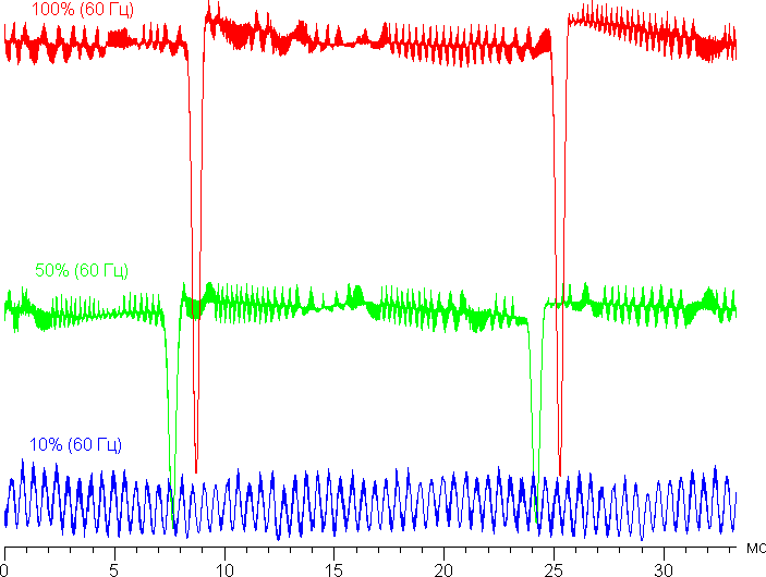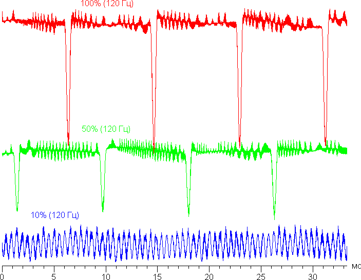 На высоком и среднем уровне яркости присутствует значимая модуляция с частотой примерно 60 или 120 Гц. На рисунке ниже приведены зависимости яркости (вертикальная ось) от времени (горизонтальная ось) для нескольких значений настройки яркости. Режим с частотой обновления 60 Гц: