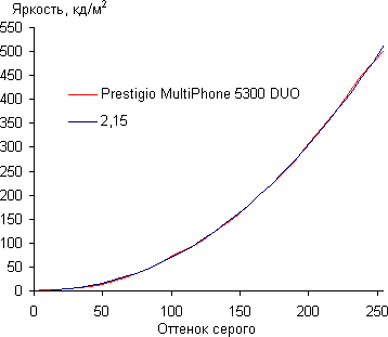Вернее — отсутствие структуры. Экран имеет хорошие углы обзора в горизонтальном направлении, но при малейшем отклонении вверх инвертируются темные оттенки, при отклонении вниз — светлые. При перпендикулярном взгляде равномерность черного поля хорошая. Контрастность низкая — порядка 540:1. Время отклика при переходе черный-белый-черный равно 10 мс (7,6 мс вкл. + 2,4 мс выкл.), переход между полутонами серого 25% и 75% (по численному значению цвета) и обратно в сумме занимает 26,5 мс. Относительно малые времена отклика — это, пожалуй, единственное положительное свойство данной матрицы. Построенная по 32 точкам гамма-кривая не выявила завала ни в светах, ни в тенях, а показатель аппроксимирующей степенной функции получился 2,15, что близко к стандартному значению 2,2, при этом реальная гамма-кривая хорошо совпадает со степенной зависимостью: