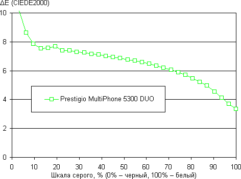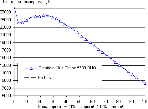 Баланса оттенков на шкале серого как такового нет вообще: цветовая температура выше стандартных 6500 К и сильно меняется от оттенка к оттенку: