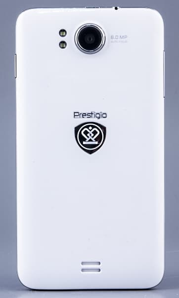 Внешность смартфона Prestigio MultiPhone 5300 Duo можно назвать симпатичной: Prestigio всегда заботилась об аккуратном виде своих продуктов, так что и здесь над дизайном явно кто-то трудился. Правда, обилие «блестяшек» может показаться дурным вкусом, но что есть, то есть: блескучих элементов на корпусе Prestigio MultiPhone 5300 Duo много, как, впрочем, и на других аналогичных продуктах фирмы. Компания в целом придерживается единого стандарта для своих смартфонов: закругленные края, достаточно широкие боковые грани с непременным металлическим (точнее, «под металл») ободком, сверкающая глянцем чуть покатая задняя крышка и, конечно же, неизменный «фамильный герб» — большой серебристый логотип, эмблема, украшающая любое устройство марки Prestigio.