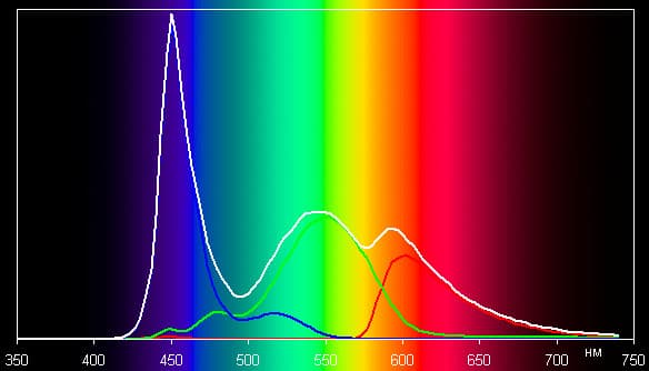 Видимо, светофильтры матрицы подмешивают компоненты друг к другу, и спектры это подтверждают. Данный прием позволяет увеличить яркость экрана при тех же затратах энергии на подсветку, но цвета теряют в насыщенности (в данном случае — незначительно).