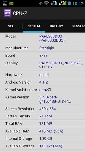 Аппаратная платформа Prestigio MultiPhone 5300 Duo строится на базе однокристальной системы (SoC) Qualcomm MSM8225Q. Центральный процессор здесь имеет 4 ядра Cortex-A5, работающих на частоте 1,2 ГГц. Помощь в обработке графики ему оказывает видеопроцессор GPU Adreno 203. Оперативной памяти в устройстве предусмотрено 1 ГБ, что вполне еще достаточно. А вот встроенной памяти у смартфона негусто — 4 ГБ номинально и не более 1 ГБ свободного места в реальности. Без карты памяти здесь, конечно, не обойтись. Режим подключения внешних устройств к порту USB (USB Host, USB OTG) здесь также не поддерживается. Естественно, нет и MHL.