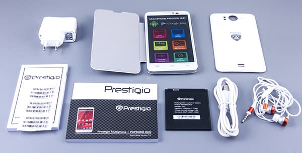 В коробке, помимо традиционных зарядного устройства, USB-кабеля и проводной стереогарнитуры с наушниками вкладного типа, на удивление, обнаружился и более необычный предмет. Дополнительный аксессуар, выполненный в виде чехла-книжки, напоминает по внешнему виду знакомые обложки от смартфонов Samsung. Здесь нет никакого окошка для считывания информации — крышка сплошная, и призвана лишь предохранять стекло экрана от возможных повреждений. Смартфон сам по себе очень большой и толстый, крышка его, естественно, еще больше увеличивает, но в целом такая забота производителя оставляет позитивное впечатление. Да и размеры современных планшетофонов, скорее всего, не так уж сильно заботят тех покупателей, кто изначально по собственной воле делает выбор в пользу «лопат». Женщины — те вообще будут носить такой аппарат в сумочке, а уж там крышка, защищающая стекло, будет еще более кстати. Да и «родная» задняя крышка, которая останется лежать про запас, когда-нибудь сможет пригодиться. Одним словом, после знакомства с комплектацией Prestigio MultiPhone 5300 Duo остается приятное послевкусие.