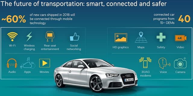 По оценке независимых экспертов, около 60% всех новых автомобилей, выпущенных в продажу к 2018 году будут иметь Интернет-соединение при помощи мобильных сетей, и компания Qualcomm уже сотрудничает с производителями автомобилей по поводу внедрения сотовых модемов компании в их решений. Так, еще с 2013 года они поставляют свои LTE-модемы модели MDM9215 компании Audi для использования в модели A3.