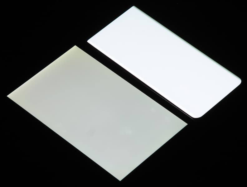 Подведем итоги. Экран имеет очень высокую максимальную яркость (до 740 кд/м²) и обладает отличными антибликовыми свойствами, поэтому устройством без проблем можно будет пользоваться вне помещения даже летним солнечным днем. В полной темноте яркость получится понизить до комфортного значения (вплоть до 1,8 кд/м²). Допустимо использовать и режим с автоматической подстройкой яркости, работающий адекватно. К достоинствам экрана нужно отнести эффективное олеофобное покрытие, отсутствие видимого мерцания, режим с высокой частотой обновления (120 Гц), а также близкий к sRGB цветовой охват и хороший цветовой баланс (при выборе правильного профиля). Заодно напомним про общие достоинства OLED-экранов: истинный черный цвет (если в экране ничего не отражается), хорошая равномерность белого поля, заметно меньшее, чем у ЖК, падение яркости изображения при взгляде под углом. Отдельно отметим, что с точки зрения качества изображения, от загнутых краев только вред, так как эта дизайнерская находка вносит искажения цветового тона и уменьшает яркость на краях картинки, а в условиях внешней освещенности приводит к неизбежным бликам вдоль хотя бы одной длинной стороны экрана. Однако в целом качество экрана очень высокое.