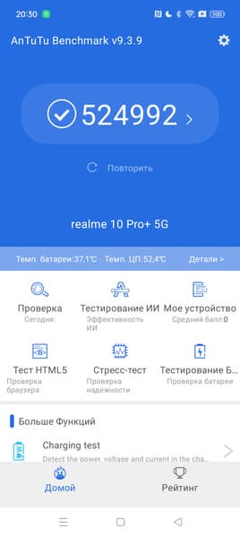 Смартфон Realme 10 Pro+ 5G получил батарею с типичным на текущий момент объемом встроенной батареи — 5000 мА·ч. Не считая быстрого разряда в требовательных играх, в остальных тестах аппарат продемонстрировал вполне приличную автономность.