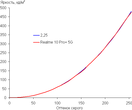 Напомним, что в случае OLED-экранов яркость фрагментов изображения динамично меняется в соответствии с характером выводимого изображения — немного уменьшается для светлых в целом изображений. В итоге полученная зависимость яркости от оттенка (гамма-кривая), скорее всего, не точно соответствует гамма-кривой статичного изображения, так как измерения проводились при последовательном выводе оттенков серого почти на весь экран.