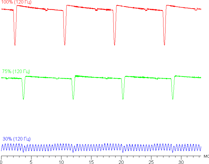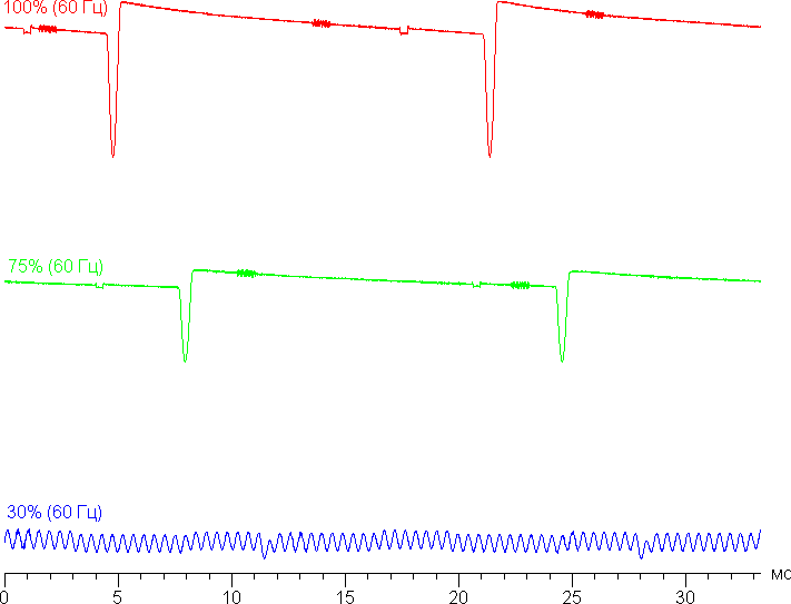 Видно, что на высокой и средней яркости амплитуда модуляции не очень большая (точнее, скважность явно низкая), в итоге видимого мерцания нет, несмотря на низкую частоту в 60 Гц. При сильном понижении яркости появляется модуляция с высокой частотой (2160 Гц) поэтому видимое мерцание всё так же отсутствует.