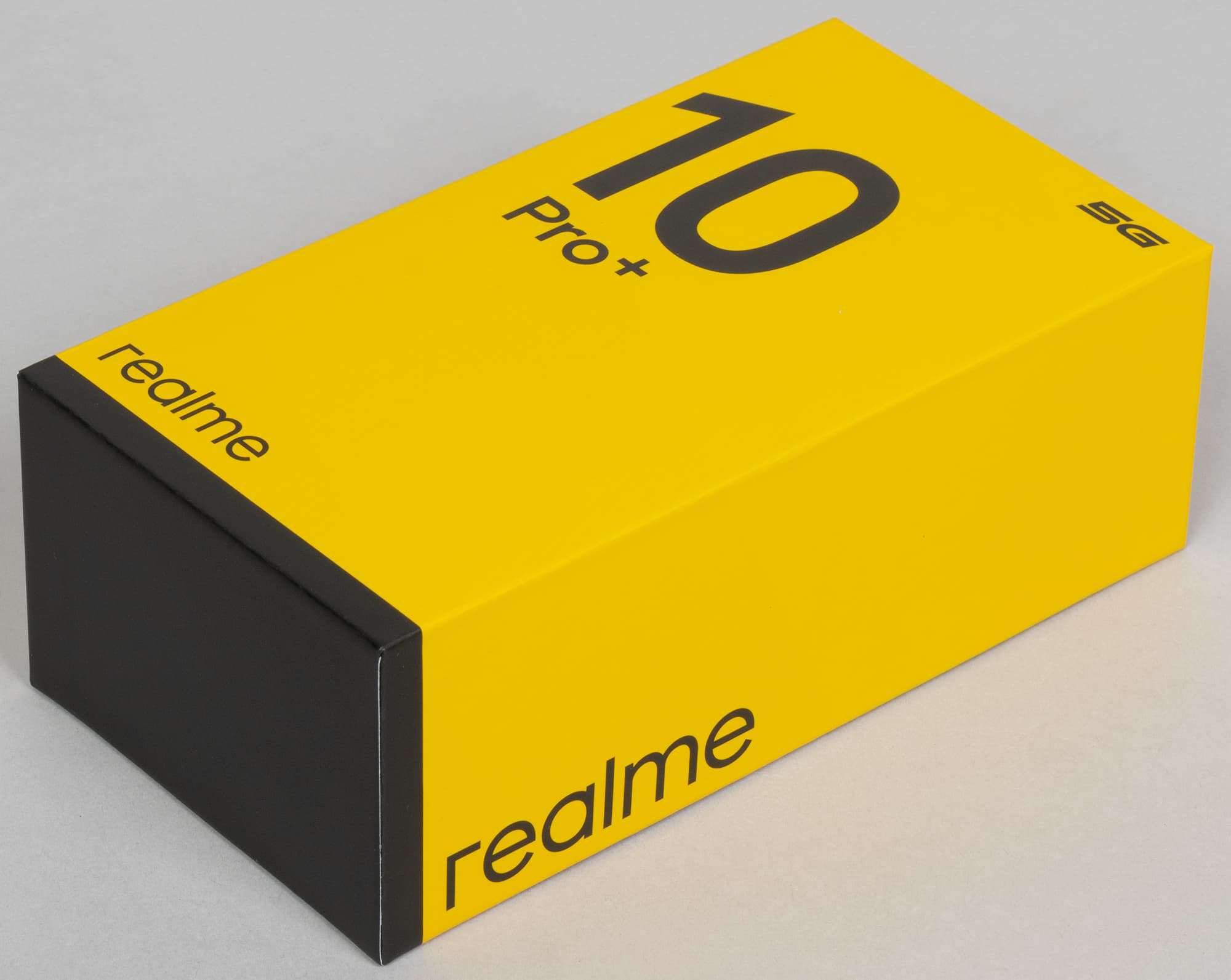 Смартфон Realme 10 Pro+ 5G поставляется в твердой упаковке с привычным оформлением в фирменных желто-черных цветах.