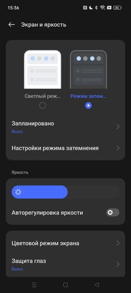 При ручном управлении яркостью и при выводе белого поля во весь экран максимальное значение яркости составило около 470 кд/м², а на очень ярком свету оно повышается до 740 кд/м². Также нужно учитывать, что в данном случае чем меньше площадь белого на экране, тем он светлее, то есть фактическая максимальная яркость белых участков будет почти всегда выше указанных значений. В итоге, учитывая отличные антибликовые свойства, читаемость днем на солнце, должна быть на хорошем уровне. Минимальное значение яркости — 1,8 кд/м², поэтому в полной темноте яркость можно понизить до комфортного значения. В наличии автоматическая регулировка яркости по датчику освещенности (он расположен под экраном правее камеры). В автоматическом режиме при изменении внешних условий освещенности яркость экрана как повышается, так и понижается. Работа этой функции зависит от положения ползунка регулировки яркости: им пользователь может попытаться выставить желаемый уровень яркости в текущих условиях. Если не вмешиваться, то в полной темноте функция автояркости уменьшает яркость до 9 кд/м² (сойдет), в условиях освещенного искусственным светом офиса (примерно 550 лк) устанавливает на 120 кд/м² (нормально), а условно под прямыми лучами солнца повышает до 740 кд/м² (до максимума). Результат по умолчанию нас удовлетворил, но для эксперимента мы попробовали понизить яркость в полной темноте. Яркость стала ниже, но после цикла повышения внешней освещенности и ее снижения, все вернулось к тем же значениям, что были до вмешательства. Впрочем, наоборот, повысить яркость в темноте получилось. То есть, функция автоподстройки яркости работает адекватно и ограниченно позволяет пользователю настраивать свою работу под индивидуальные требования.