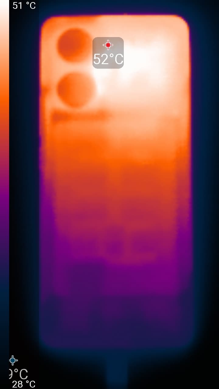 Нагрев больше в верхней части аппарата, что, видимо, соответствует расположению микросхемы SoC. По данным теплокамеры, максимальный нагрев составил 52 градуса (при температуре окружающего воздуха в 24 градуса), это высокий нагрев в случае данного теста в сравнении с другими современными производительными смартфонами.