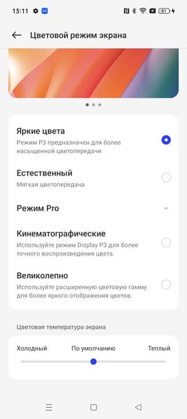 Фотография выше получена для профиля Яркие цвета в настройках экрана, который выбран по умолчанию. Профилей всего четыре: