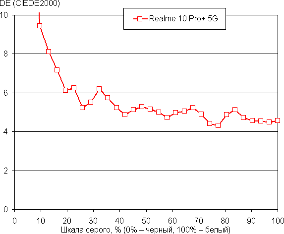 (Самые темные области шкалы серого в большинстве случаев можно не учитывать, так как там баланс цветов не имеет большого значения, да и погрешность измерений цветовых характеристик на низкой яркости высокая.)
