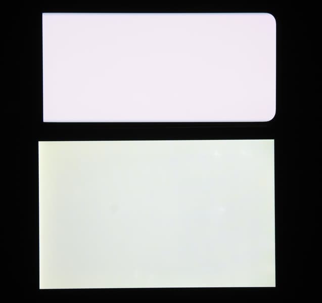 Отметим хорошую равномерность яркости и цветового тона белого поля (за исключением едва видимого затемнения и изменения оттенка к загнутым краям).