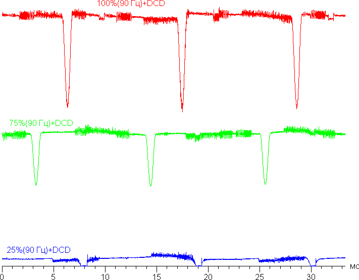 При включении функции DC Dimming характер модуляции немного меняется — на низкой яркости амплитуда и частота снижаются, мерцание визуально не обнаруживается: