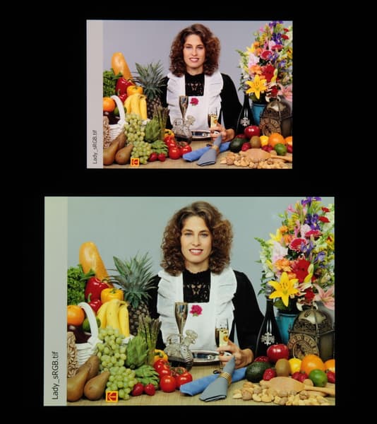 Цвета на экране Realme 10 перенасыщены (обратите внимание на помидоры, бананы, салфетку и оттенок лица), а цветовой баланс заметно отличается. Напомним, что фотография не может служить надежным источником сведений о качестве цветопередачи и приводится только для условной наглядной иллюстрации. В частности, выраженный красноватый оттенок белого и серого полей, присутствующий на фотографиях экрана Realme 10, при перпендикулярном взгляде визуально отсутствует, что подтверждается аппаратными тестами с помощью спектрофотометра. Причина в том, что спектральная чувствительность матрицы фотоаппарата неточно совпадает с этой характеристикой человеческого зрения.