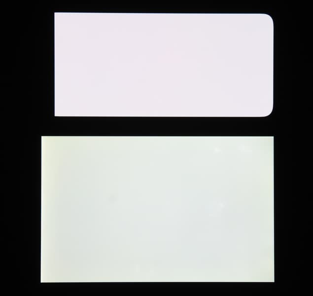 Экран характеризуется великолепными углами обзора. Правда, белый цвет при отклонении даже на небольшие углы приобретает легкий радужный оттенок, но черный цвет остается просто черным под любыми углами. Он настолько черный, что параметр контрастности в данном случае неприменим. Для сравнения приведем фотографии, на которых на экраны Realme 10 и Nexus 7 выведены одинаковые изображения, при этом яркость экранов изначально установлена примерно на 200 кд/м², а цветовой баланс на фотоаппарате принудительно переключен на 6500 К.