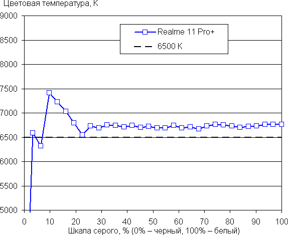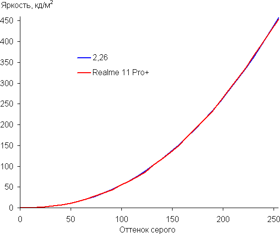 Напомним, что в случае OLED-экранов яркость фрагментов изображения динамично меняется в соответствии с характером выводимого изображения — немного уменьшается для светлых в целом изображений. В итоге полученная зависимость яркости от оттенка (гамма-кривая), скорее всего, не точно соответствует гамма-кривой статичного изображения, так как измерения проводились при последовательном выводе оттенков серого почти на весь экран.