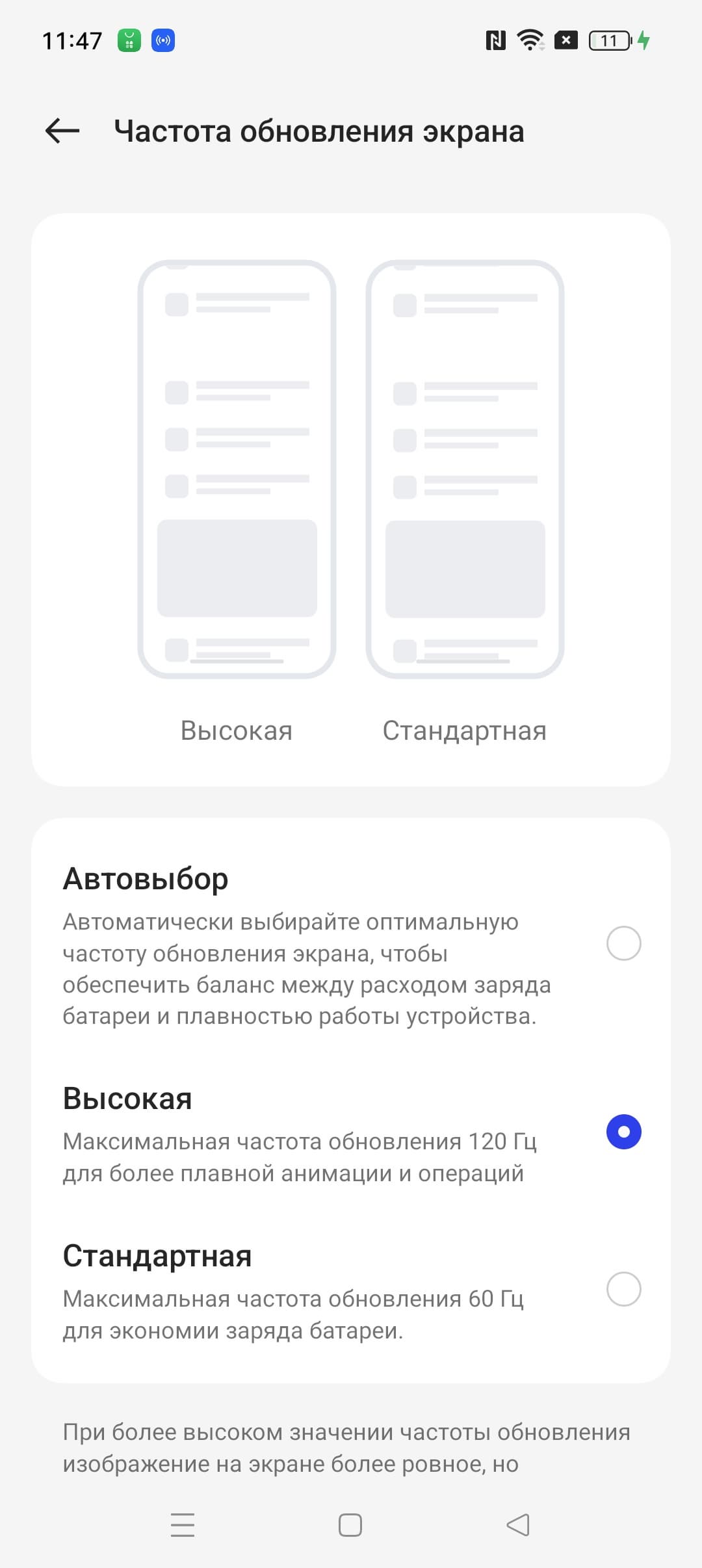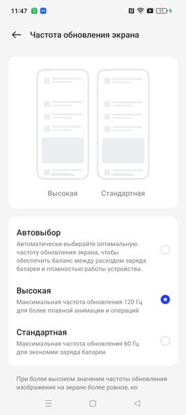 В настройках экрана можно включить режим с повышенной до 120 Гц частотой обновления: