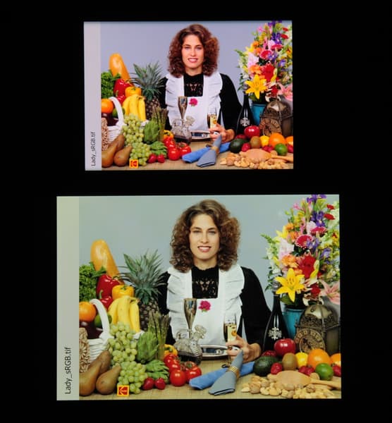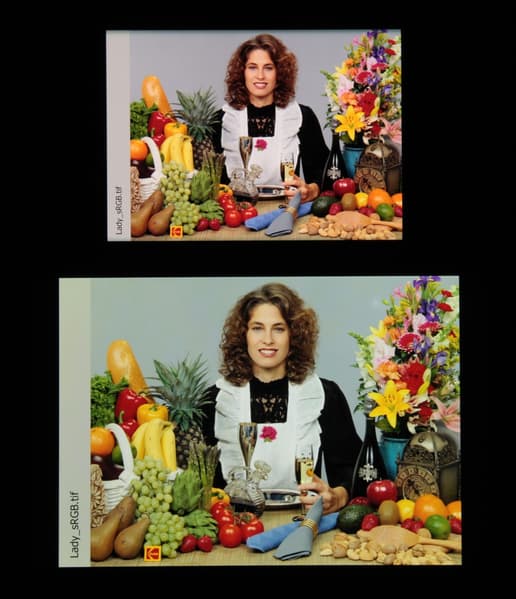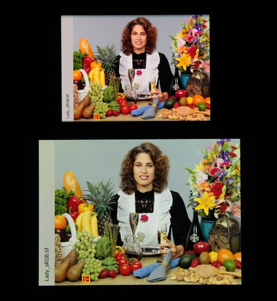 Отметим хорошую равномерность яркости и цветового тона белого поля (за исключением едва видимого затемнения и изменения оттенка к загнутым краям).