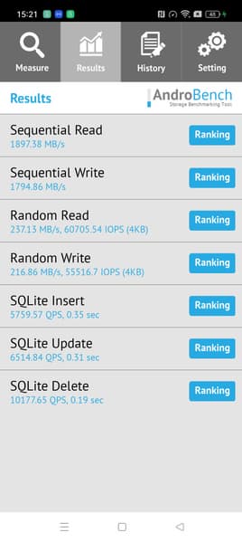 Результаты теста AndroBench на скорость работы с памятью: