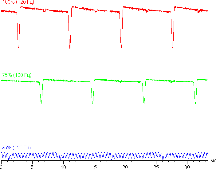 На любом уровне яркости присутствует значимая модуляция с частотой примерно 60, 120 или 2160 Гц. На рисунке ниже приведены зависимости яркости (вертикальная ось) от времени (горизонтальная ось) для нескольких значений настройки яркости. Сначала для режима с частотой обновления 60 Гц: