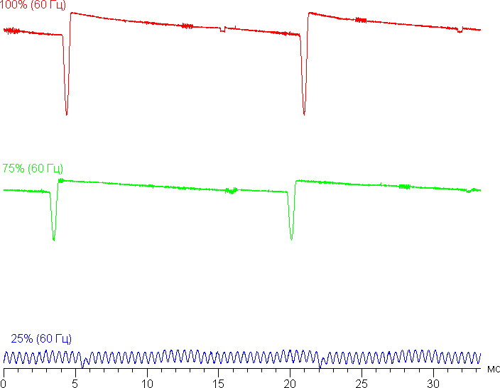 Видно, что на высокой и средней яркости амплитуда модуляции не очень большая (точнее скважность явно низкая), в итоге видимого мерцания нет, несмотря на низкую частоту в 60 Гц. При сильном понижении яркости появляется модуляция с высокой частотой (2160 Гц) поэтому видимое мерцание все также отсутствует.