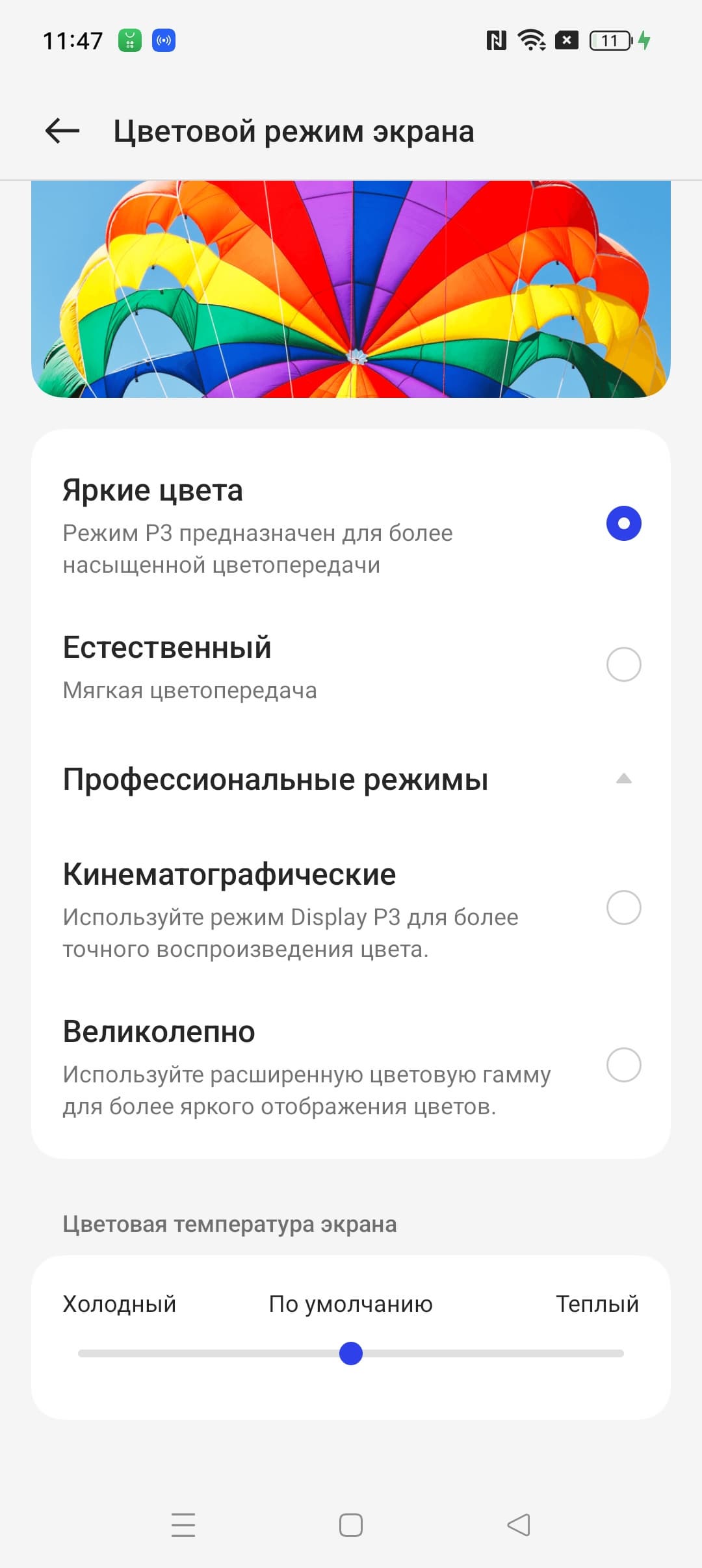 Фотография выше получена для профиля Яркие цвета в настройках экрана, который выбран по умолчанию. Профилей всего четыре: