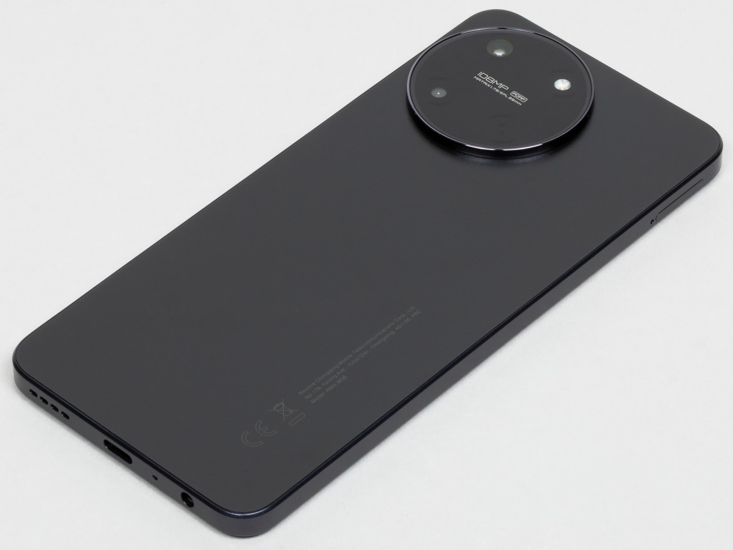 Черная версия смартфона выглядит просто и строго: у корпуса чистая матовая поверхность без каких-либо узоров и градиентных переходов. Это, возможно, делает аппарат не слишком привлекательным для молодежи, но для более взрослой аудитории будет в самый раз. Аккуратно и симметрично расположенные элементы, минимум «блеска» — по внешнему виду Realme 11 трудно сходу угадать его ценовую категорию.