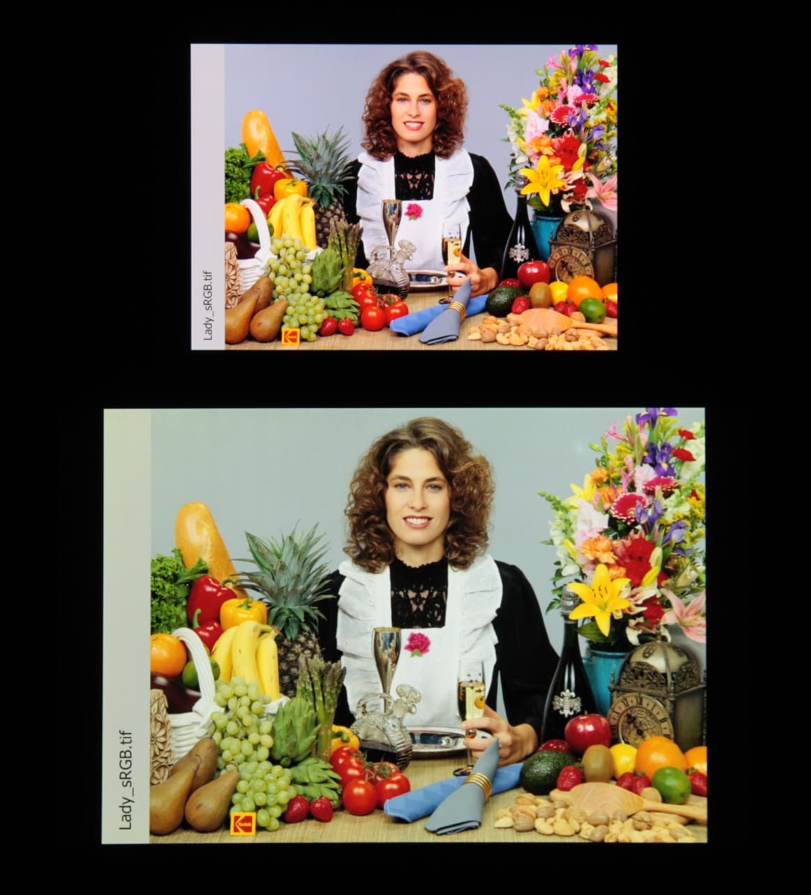 Цвета на экране смартфона перенасыщены (обратите внимание на помидоры, бананы, салфетку и оттенок лица), а цветовой баланс заметно отличается. Напомним, что фотография не может служить надежным источником сведений о качестве цветопередачи и приводится только для условной наглядной иллюстрации. В частности, выраженный красноватый оттенок белого и серого полей, присутствующий на фотографиях экрана смартфона, при перпендикулярном взгляде визуально отсутствует, что подтверждается аппаратными тестами с помощью спектрофотометра. Причина в том, что спектральная чувствительность матрицы фотоаппарата неточно совпадает с этой характеристикой человеческого зрения.