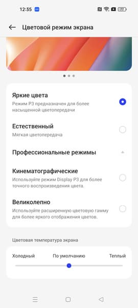 Фотография выше получена для профиля Яркие цвета в настройках экрана, который выбран по умолчанию. Профилей всего четыре:
