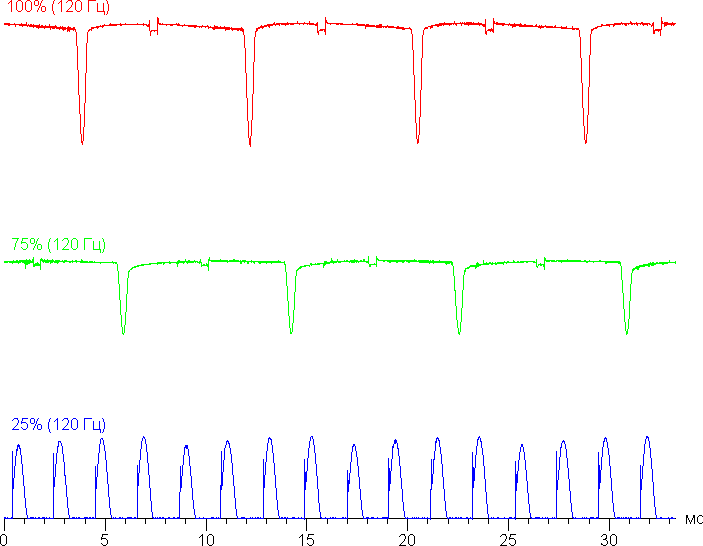 Видно, что на высокой яркости амплитуда модуляции не очень большая (точнее скважность явно низкая), в итоге видимого мерцания нет. Однако при сильном понижении яркости появляется модуляция с большой относительной амплитудой и высокой скважностью, ее наличие уже можно увидеть в тесте на присутствие стробоскопического эффекта или просто при быстром движении глаз. В зависимости от индивидуальной чувствительности такое мерцание может вызывать повышенную утомляемость. Впрочем, фаза модуляции различается по площади экрана, а частота довольно высокая (480 Гц), поэтому негативный эффект от мерцания снижен.