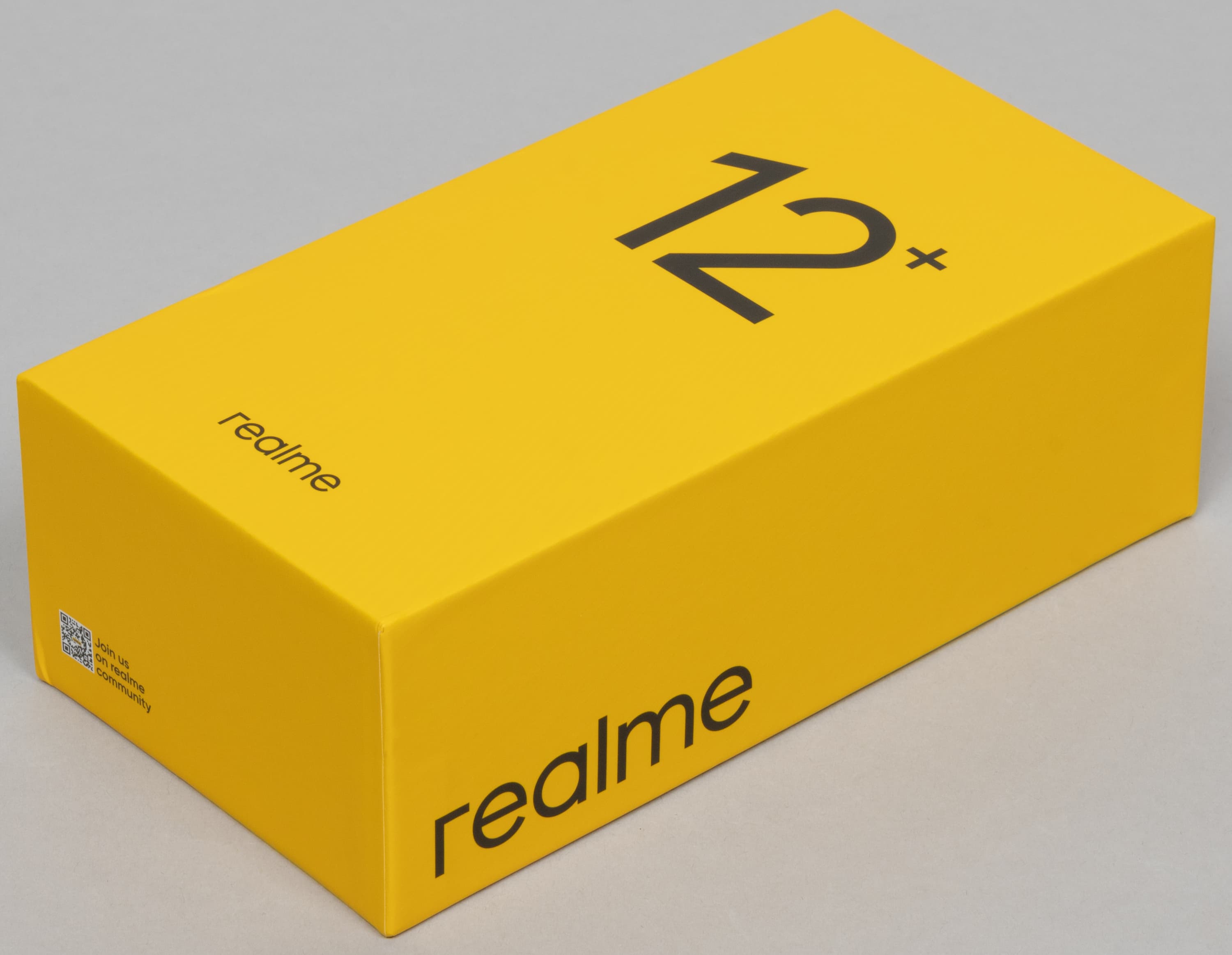Смартфон Realme 12+ 5G поставляется в картонной коробке с оформлением в фирменных цветах бренда.