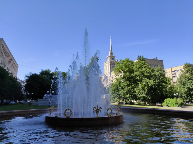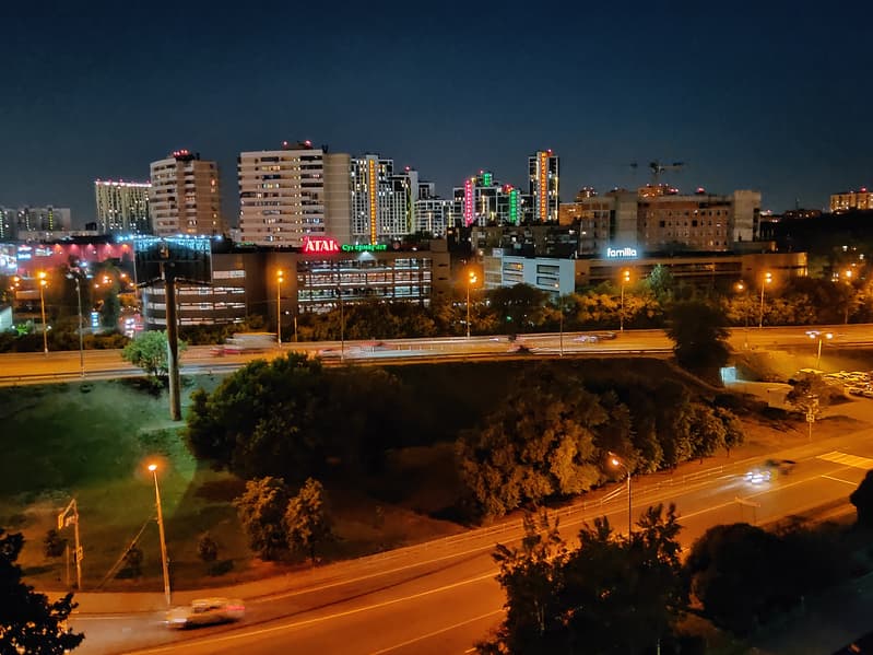 В ночном режиме камера делает и сшивает воедино несколько последовательных снимков, пытаясь ликвидировать результат дрожания рук. Результат получается светлым и адекватно передает источники освещения и подсвеченные участки, но показывать его можно только в виде миниатюры (желательно на экране смартфона и издалека), поскольку светочувствительность снимков для короткой выдержки задирается до неадекватных значений и деталей на снимке просто не остается. В то же время, при съемке ночью в обычном режиме, если вы сумеете компенсировать дрожание рук при относительно длинной выдержке, смартфон выдает очень хорошую картинку, уступающую разве что специализированным ночным режимам флагманов. Таким образом, для обоих возможных сценариев ночной съемки смартфон подходит очень хорошо.