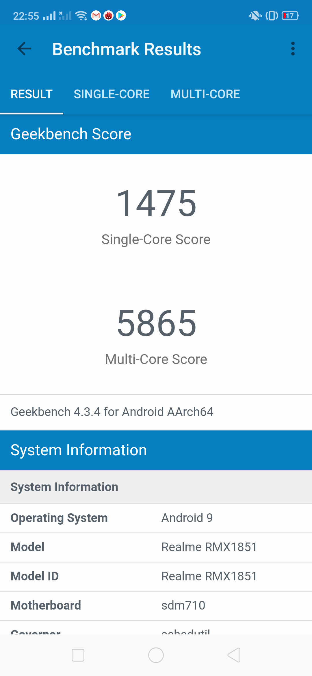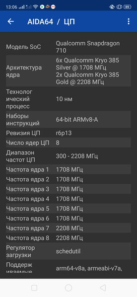 - SoC Qualcomm Snapdragon 710, 8 ядер (2 Kryo 360 Gold @2,2 ГГц + 6 Kryo 360 Silver @1,7 ГГц)